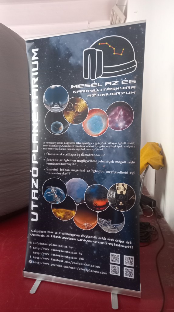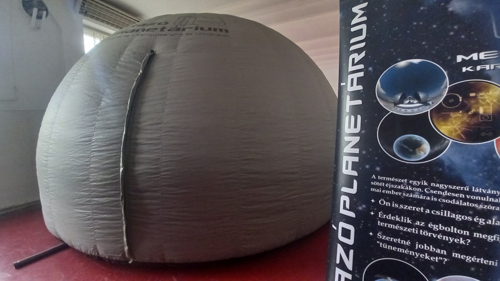 Korcsoport szerint nagyjából 25 fős csoportokra lettünk osztva, és több turnusban mentünk be a meleg levegővel felfújt pici sátorba, ahol minden csoport több filmből választhatott egyet, amit meg akart nézni. Volt többek között 4D-s kisfilm a sötét anyagról, a bolygók közötti utazásról, a csillagokról, és még sok másról. Az én osztályom, a tizedik a sötét anyagot választotta, ami nem volt hosszú, de annál érdekesebb. Köszönjük az Utazó Planetáriumnak, hogy eljöttek hozzánk.